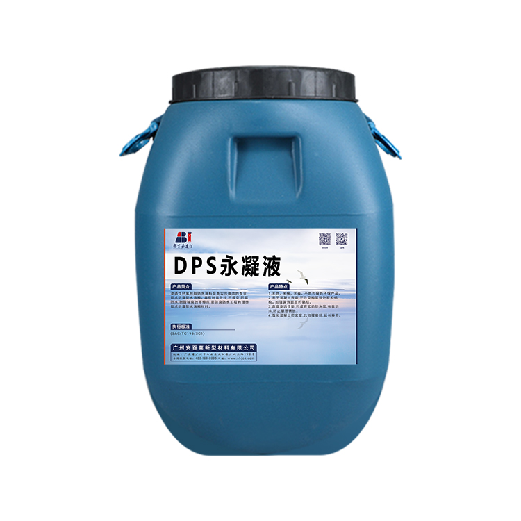 DPS永凝液为碱的化学渗透液,属无机材料。 水性渗透型无机防水剂能够渗入到混凝土内部并与碱在水或水汽条件下发生化学反应生成硅凝胶,其的渗透作用以及与碱的化学反应,形成粘性胶,覆盖毛隙孔道,完全充满小的空隙。这层硅凝胶呈坚固、透气、玻璃针状结构的物质,其生成物成为混凝土永远的一部分而不仅仅是表面的涂层。因此只有水和碱存在的条件下,该过程就会不断重复,直到混凝土碱骨料反应,密封过的混凝土仍然能够“呼吸”。